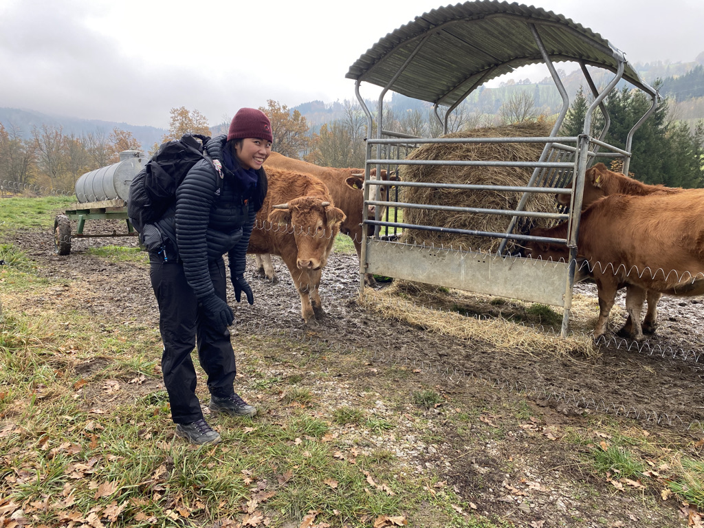 Now on the actual first day of hike, we started by climbing over a hill guarded by ruminating cows. Then we strolled through a short forested area, ending up along a river. The unwelcoming wet muddy path makes each of our step goes “splosh”, and intimidatingly makes the ground feels like quick-sand. The cold makes it treacherous to take it slow as we needed our body heat to stay warm. Even rests are not as restful as resting too long would quickly usher the cold into our bones. Nevertheless, it was nice to be out and about, enjoying the outdoors.