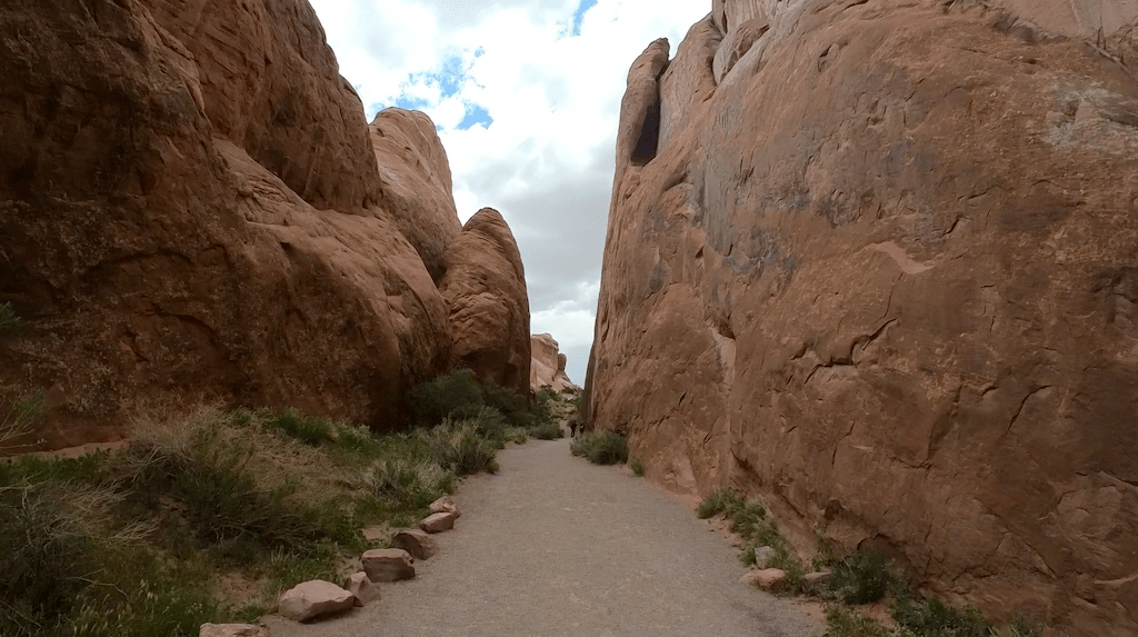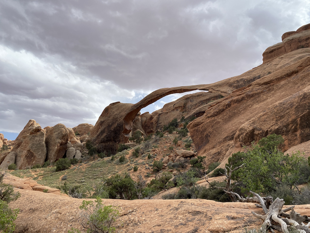 Landscape arch, or what’s left of it is a dainty large overhang, almost like a walkable bridge. In 1990s, when tourists were hanging around here, it collapsed. The rubble there was part of the arch.