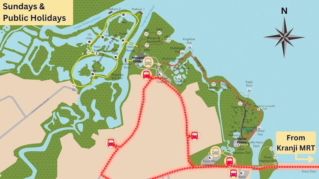 - Option 2 (Saturdays): On Saturdays, you can use Option 1 and also take the Kranji Farms Shuttlebus, which gets you closer to the reserve for a fee of $5 per person per day.