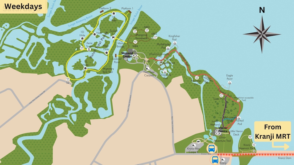 - Option 1 (Weekdays): Take the MRT train to Kranji station and then hop on bus 925 to reach the southern part of the visitor center.