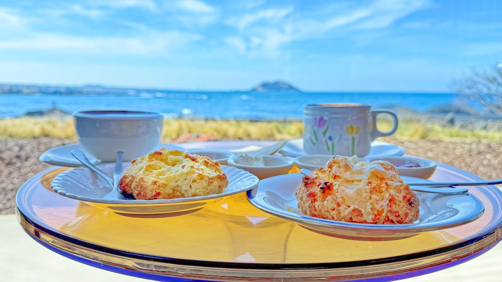 The best part about this cafe is enjoying their scones with HOT tea, sitting in their rustic garden interior, and the rocky ocean in the background.
