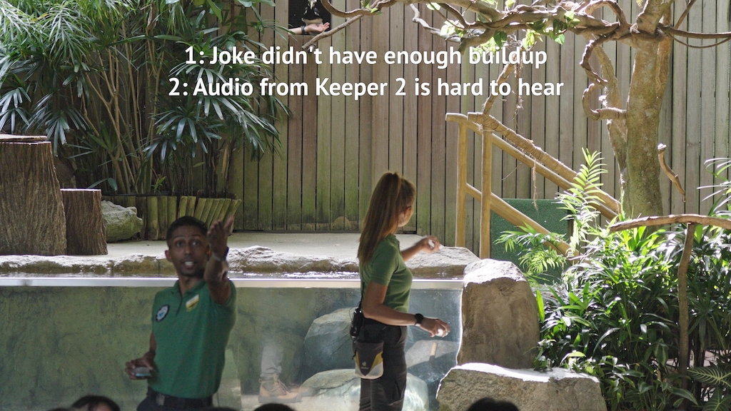 - Some of the back and forth jokes felt odd. Especially when the keeper tries to pretend the bird is flying in from the “back” of the seats instead of the “back” of the stage