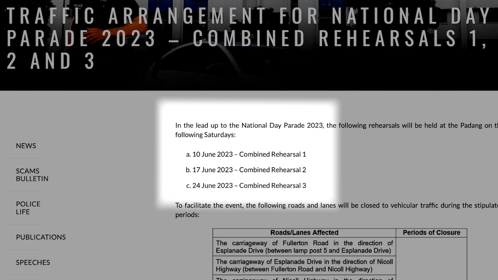 My cheat code is to look out for the Traffic Advisories by the LTA. They ALWAYS issue this in advance because NDP rehearsals ALWAYS disrupt traffic.