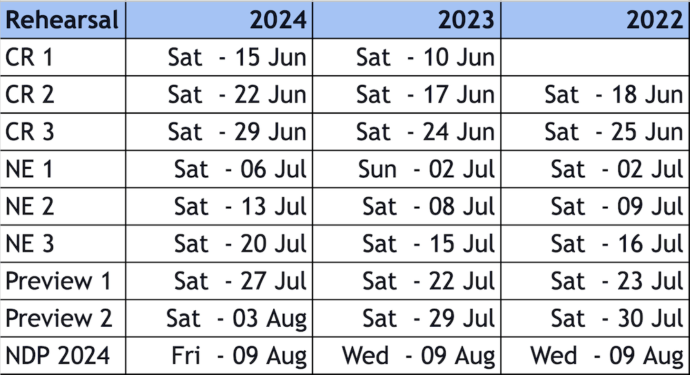 Looking at the dates of the rehearsals in the past years: The rehearsals run every weekend from the middle of June up till the actual day of celebration. They run MOSTLY on Saturday evenings, BUT to be sure, look up the official NDP website to get the schedule because on SOME occasion it may run on a Sunday.